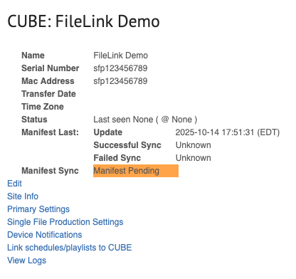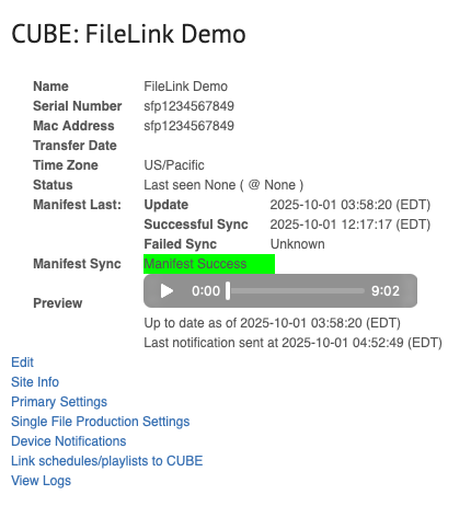 What FileLink then does, is that it generates a mixed production automatically whenever the linked content changes (for example: new content added, not-before/not-after dates trigger, etc) according to the same “primary settings” as the physical device would use (fade time etc), and executing the full interleaving logic.   It then sends a branded email to the email addresses linked to that serial, to notify them of the new content.  It doesn’t include the mixed file directly on this email, but instead a button to a web page from where the customer can “download” the file.   When the customer “downloads” the file, this updates the manifest status indicator in MC (in the same way this works for physical devices).
